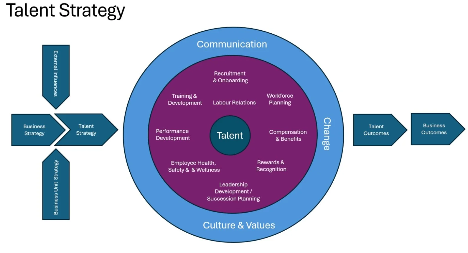 The wheel in the middle is where the Talent Strategy comes to life - and where HR delivers value. The central focus is supporting Talent – the people employed or contracted by the organization to bring the right skills and experience to deliver on the strategy.
